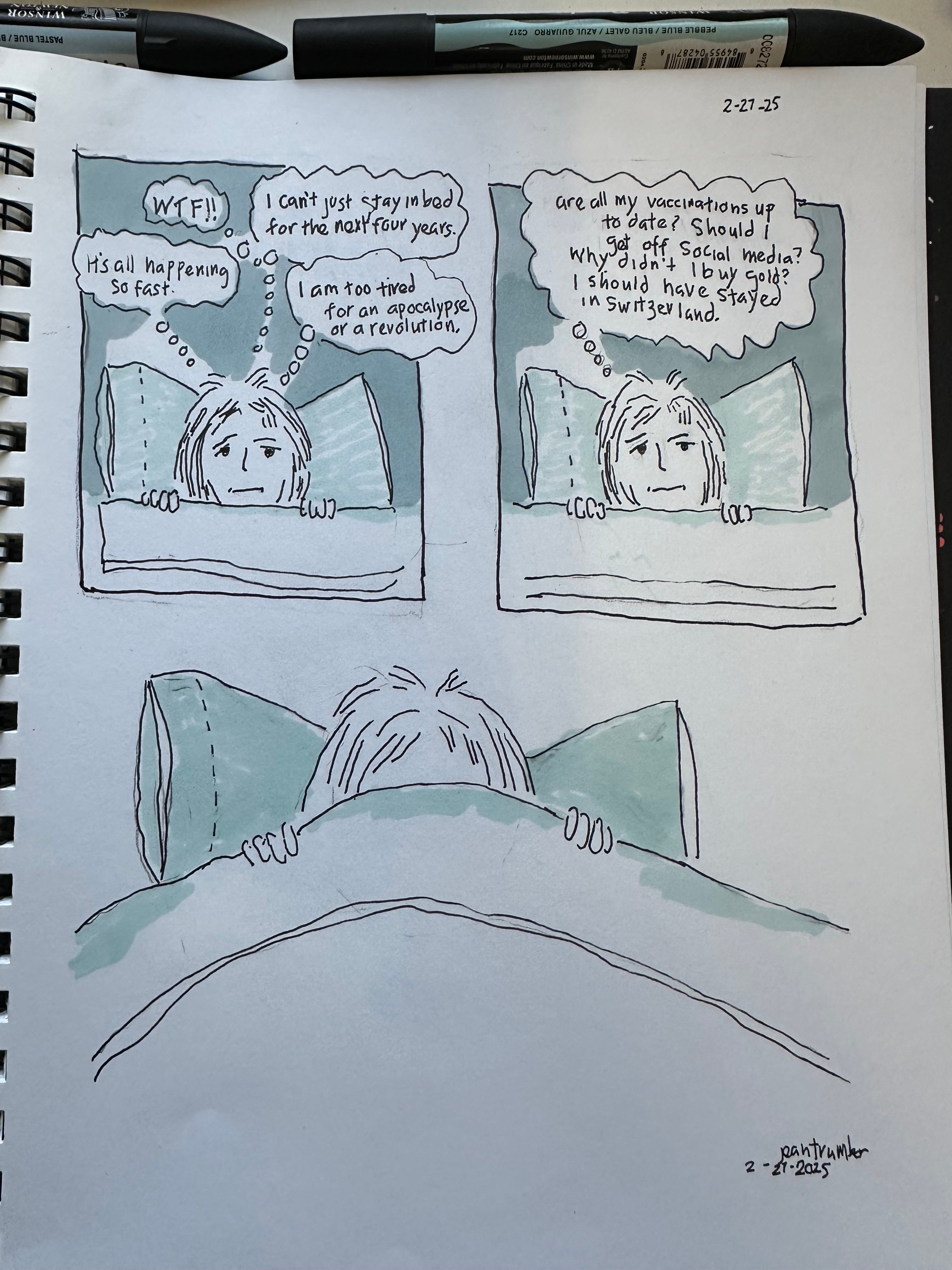 Drawing has always been meditative for me. I use cartoons or caricature to express what I see, hear, and feel about what is going on in the world. Its simple visual style is shorthand for often complicated stories. Cartoons have always been part of my personal visual journals. I didn’t often share them. But lately, as my drawing has improved, and the daily drip, drip, drip of the current political climate has gotten more grim and frightening, I feel the need to share. As part of the disability community, I know that I am not alone in worrying about the impacts of the cuts to essential services, social security, medicare and healthcare. It’s impossible to keep up. As my lifelines disappear I feel vulnerable. I feel scared.